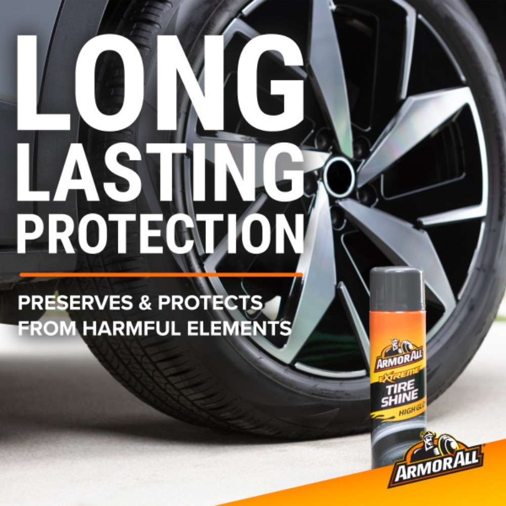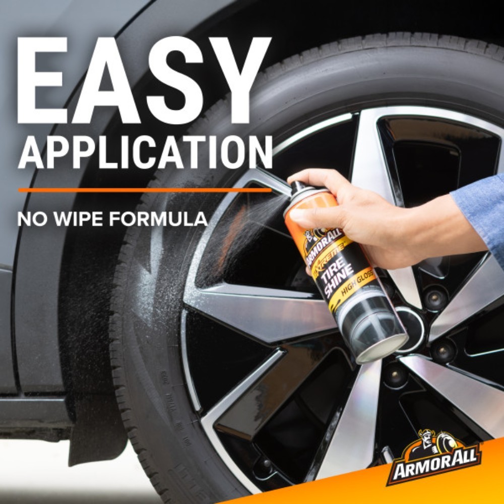 Extreme tire shine spray, delivers intense, mirror-like shine and a rich black look in a convenient aerosol spray.
