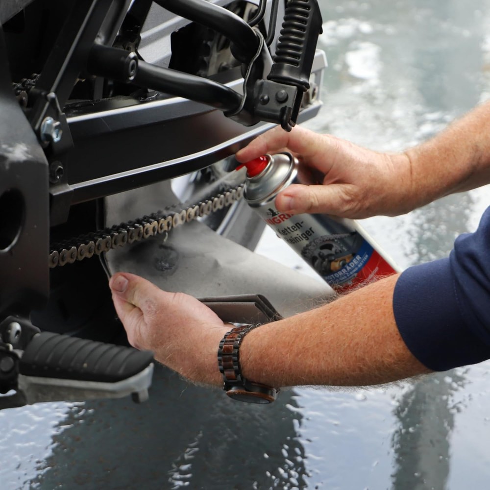 Suitable for O-, Z-, and X-ring chains. Cleans and degreases all motorcycle chains and reduces wear: removes contaminated chain grease and the dirt bound to it. Prevents wear of chain components caused by contamination. Improves smooth operation.