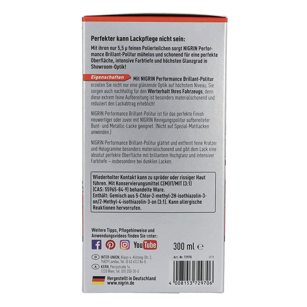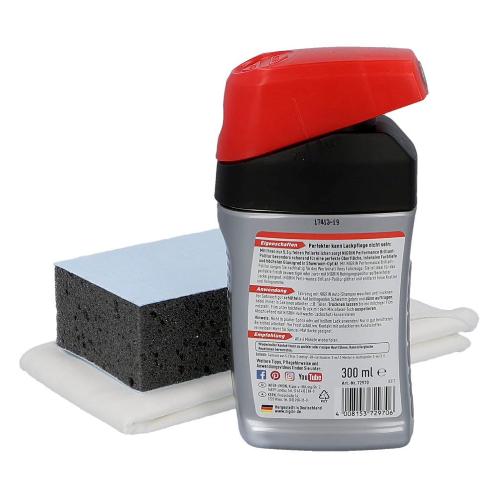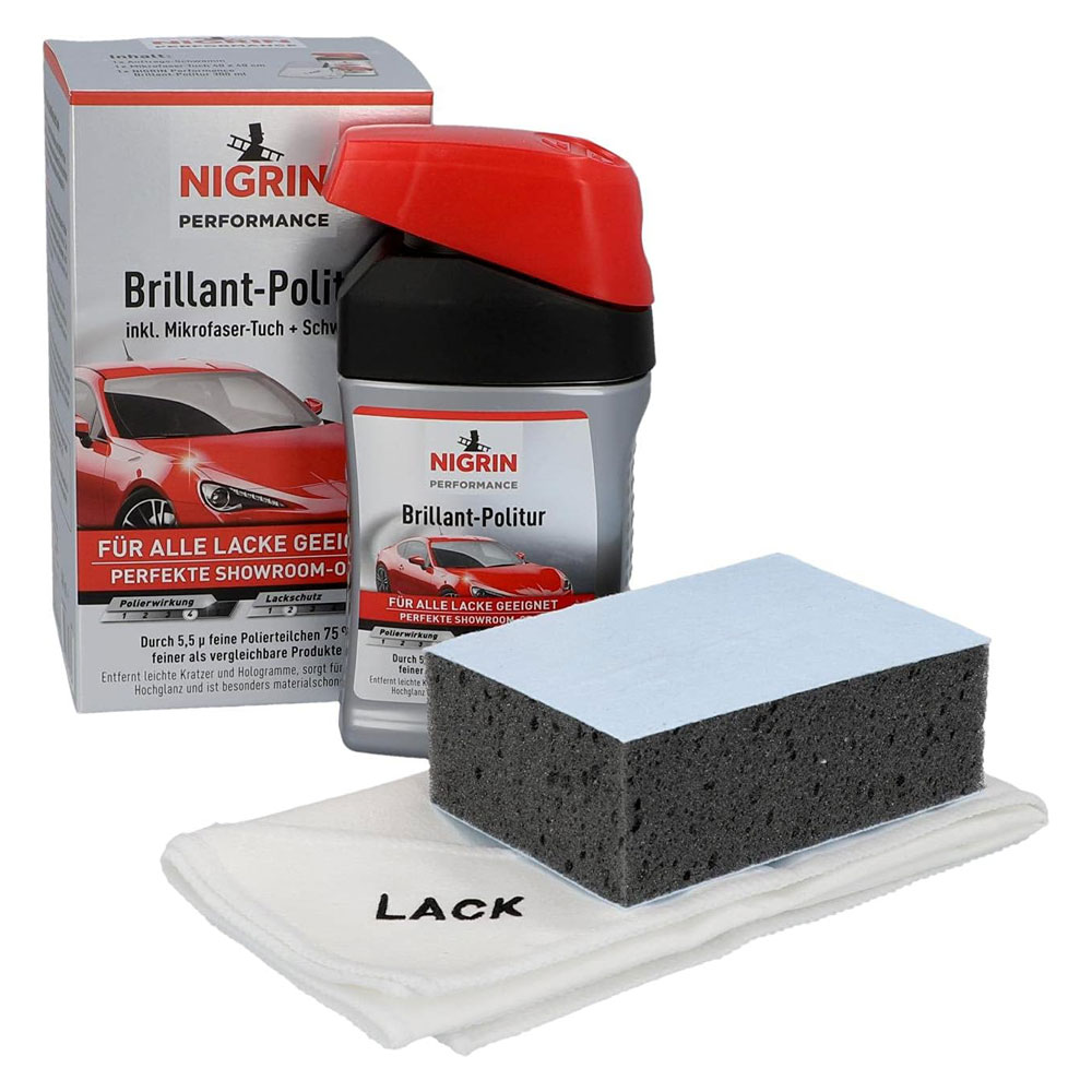 The NIGRIN polish consists of particularly fine polishing particles, only 5.5?. This guarantees impressive results with a showroom appearance. With the NIGRIN polishing fluid it is possible to remove small scratches and smudges on the painted surface. The application of NIGRIN car polish is particularly gentle on materials. With dark paints, NIGRIN polyurethane provides impressive results with a high gloss finish. With NIGRIN’s brilliant polish, the car’s colour is intensified and the paint shines in full brilliance. The NIGRIN brilliant polish kit includes a sponge and microfibre cloth. These are all the necessary tools to get the application started directly. NIGRIN brilliant polish is suitable for all types of paint. This also applies to cars with coloured or metallic paint.