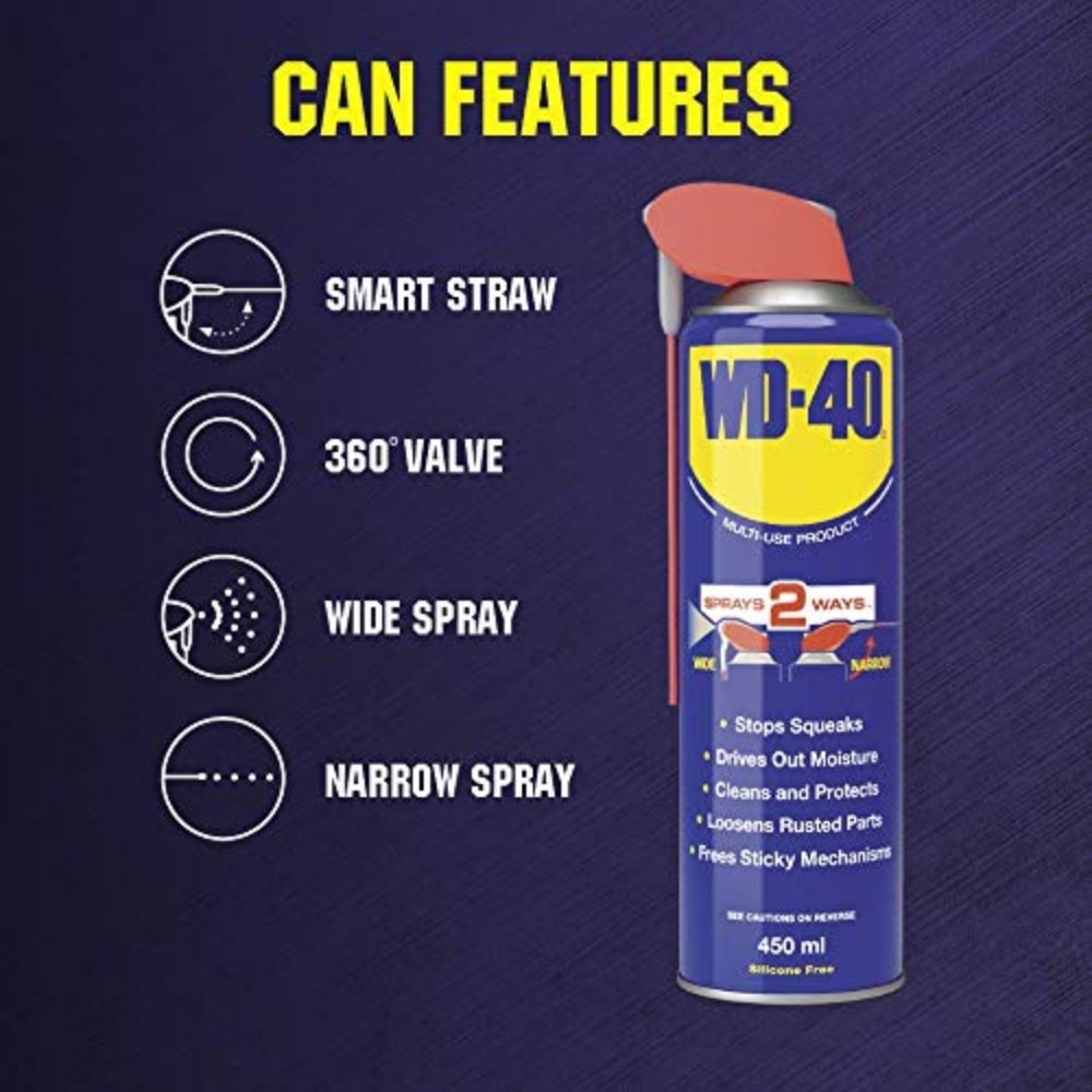 WD-40 Smart Straw is the well-known all-purpose lubricating and protective spray, now with an integrated Smart Straw nozzle that lets you choose between precise spraying and wide coverage. One can – multiple solutions for the home, car, workshop, and industry.