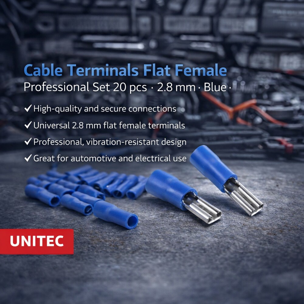 The UNITEC 2.8 mm flat female cable terminal set is designed for both professional and DIY use where a stable connection, easy installation, and long-lasting performance are required. Suitable for electrical installations, automotive electronics, home repairs, and industrial applications.