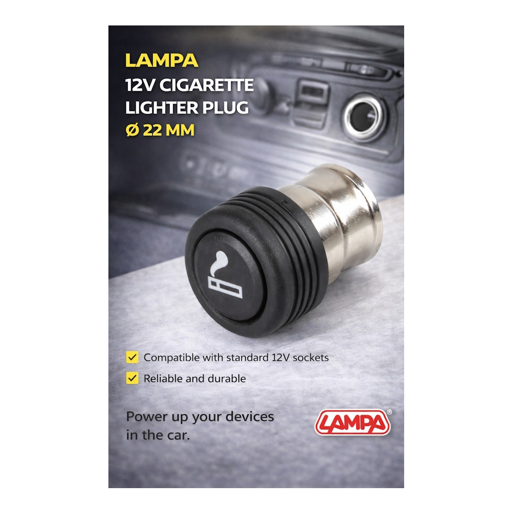 The LAMPA plug is designed for easy and secure connection of electronic devices to the car cigarette lighter socket. It is suitable for powering GPS units, chargers, compressors, and other 12V accessories.