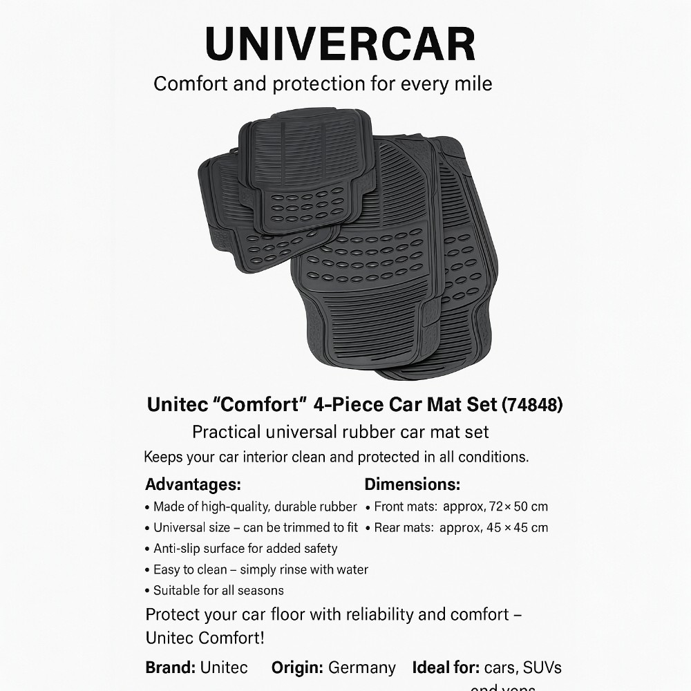Keep your car interior clean and protected with the CARTREND “Comfort” universal rubber car mats. Made from high-quality, durable material, they protect your vehicle’s floor from dirt, moisture, and wear – all year round.