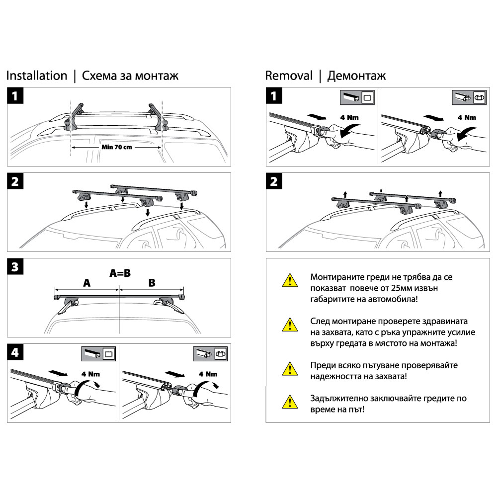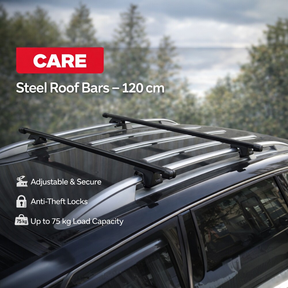 Stable and durable metal roof bars with a length of 120 cm, specially designed for installation on car roofs. Perfect for carrying cargo, luggage, or sports equipment such as bicycles, skis, and more. They provide reliable support and safety on every trip.