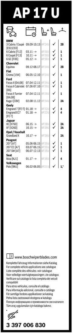 Upgrade your visibility with the BOSCH AeroTwin AP17U (425 mm) – quiet, smooth wiping, long-lasting performance, and easy installation for confident driving in any weather.
