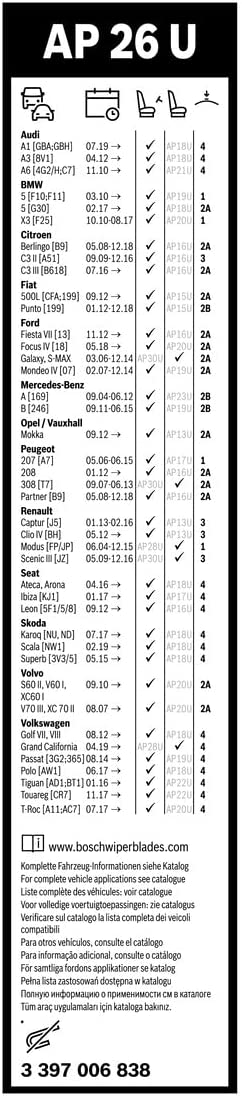 Suitable for various vehicle models with 650 mm front wiper blades and hook-type or other standard wiper arms. Commonly used as the driver-side (left) wiper blade in combination with a shorter one.