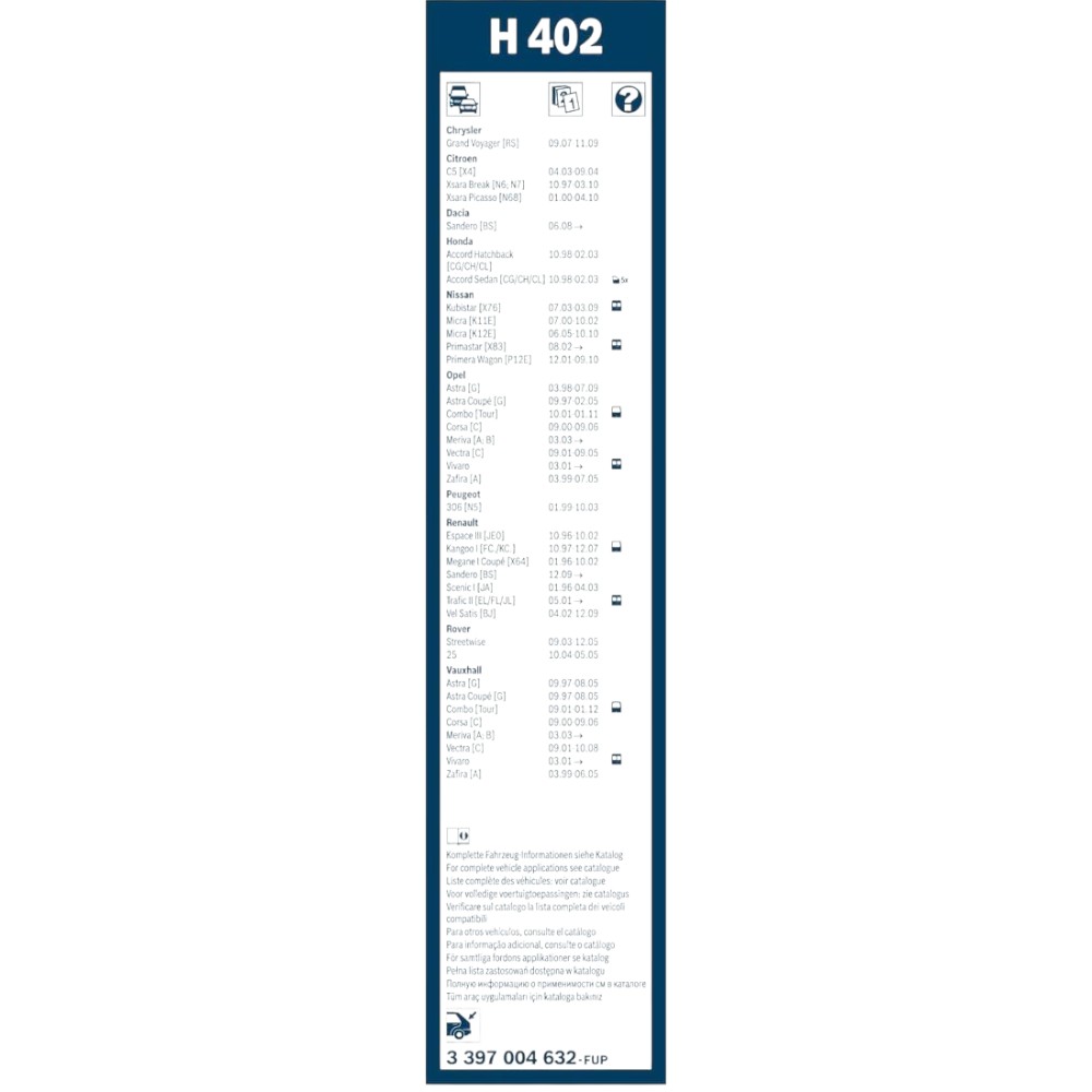 Ensure a clean rear window and excellent visibility in rain, snow, and dust! BOSCH Rear H402 is a reliable rear wiper blade with high-quality rubber and a sturdy construction, designed for quiet and efficient performance in all conditions.