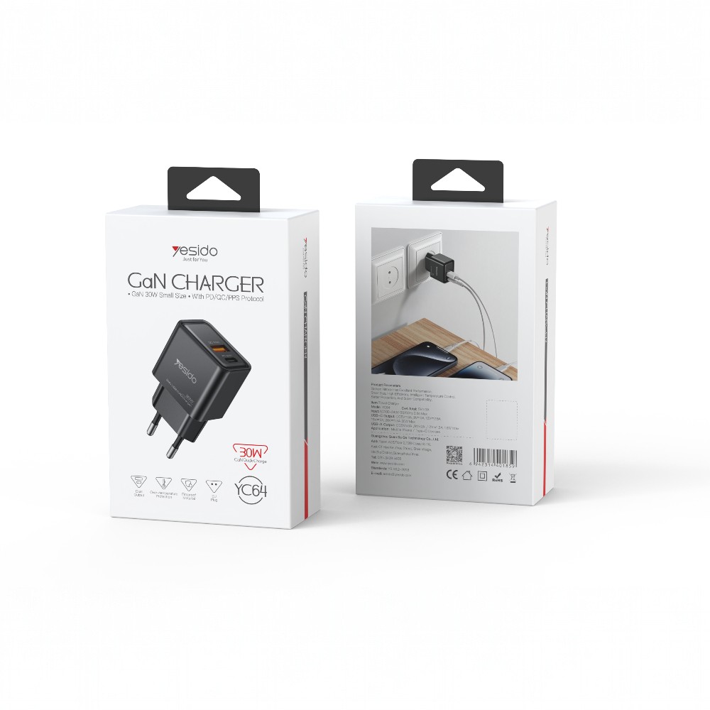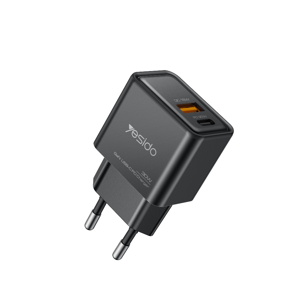 Модерно и високоефективно GaN зарядно устройство YESIDO 30W, създадено за бързо, стабилно и безопасно зареждане. Благодарение на GaN (галиев нитрид) технологията, зарядното е по-компактно, по-малко загрява и осигурява по-висока ефективност спрямо стандартните зарядни.