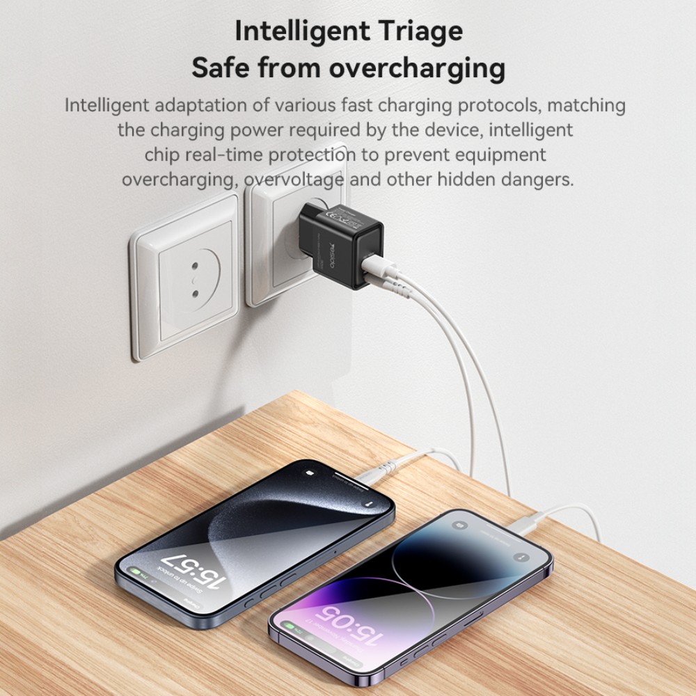 С разположени USB-C порт (до 30W) и USB-A порт (до 18W) можете да зареждате едновременно две устройства – смартфони, таблети, слушалки и други съвместими аксесоари. Подходящо за дом, офис и пътуване, с универсален вход 230V.