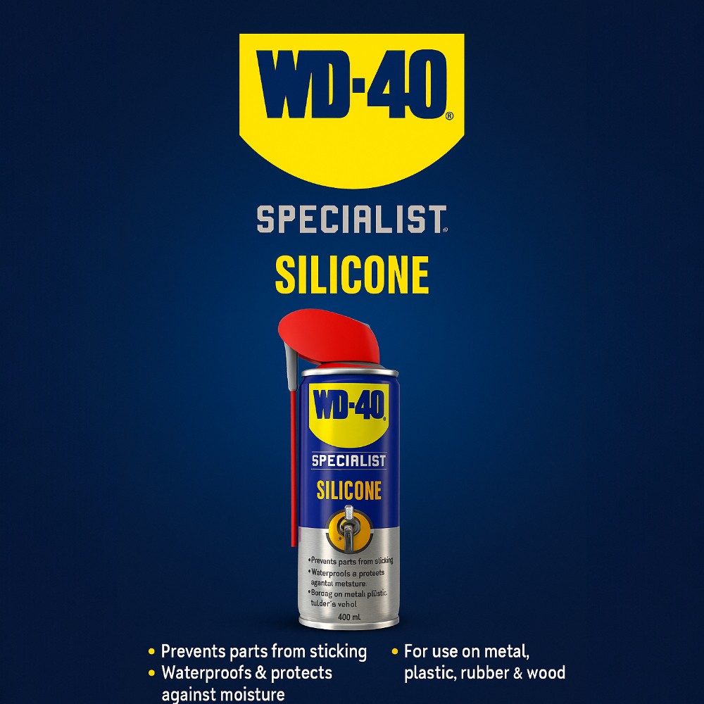 WD-40 Specialist Силиконов спрей е високоефективен смазочен и защитен продукт, специално създаден за третиране на повърхности, подложени на триене, износване и влага. Формулата не съдържа минерални масла, изсъхва бързо и образува чиста, невидима защитна бариера.