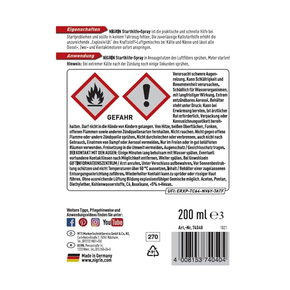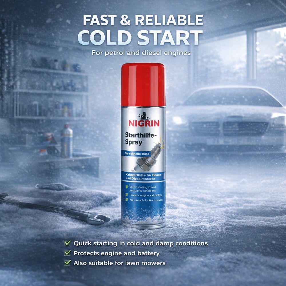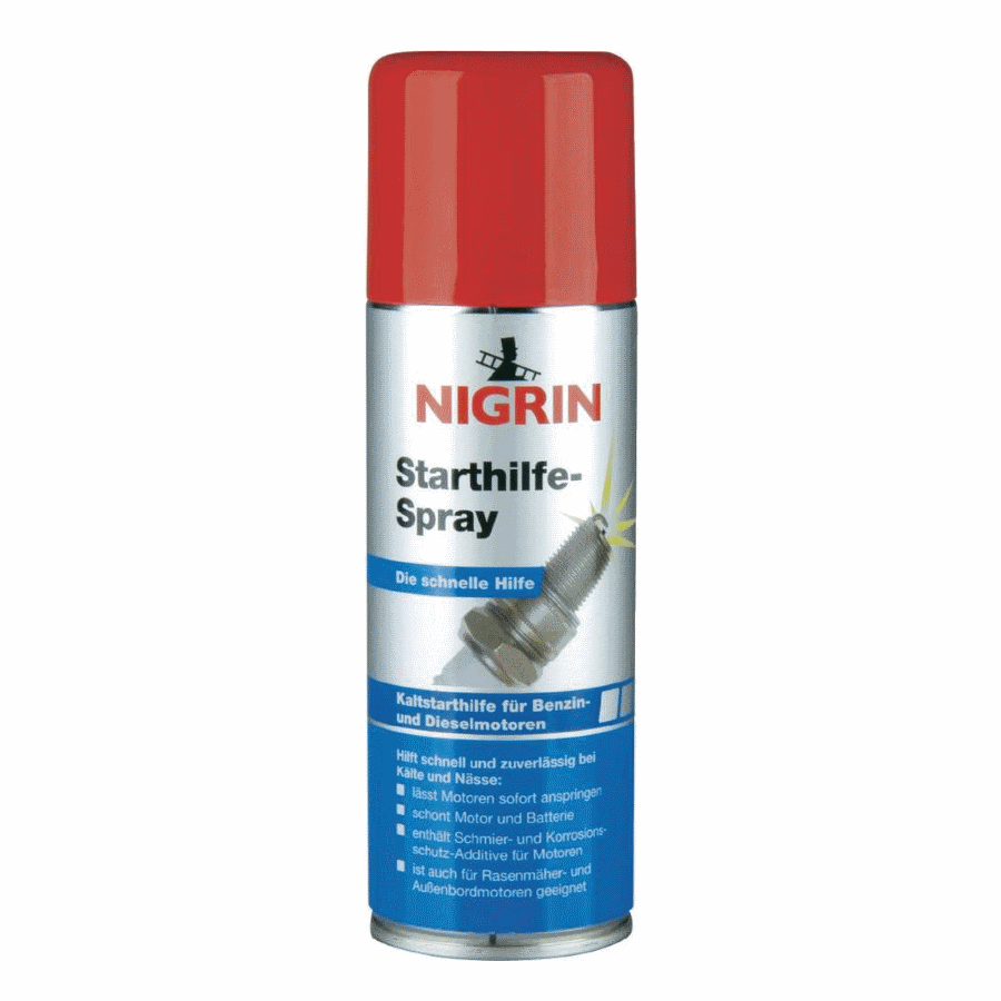 NIGRIN Starthilfe-Spray е Вашият верен помощник при проблеми със запалването. Повишава „експлозивността“ на горивно-въздушната смес и позволява на всички дизелови, двутактови и четиритактови двигатели да стартират незабавно.