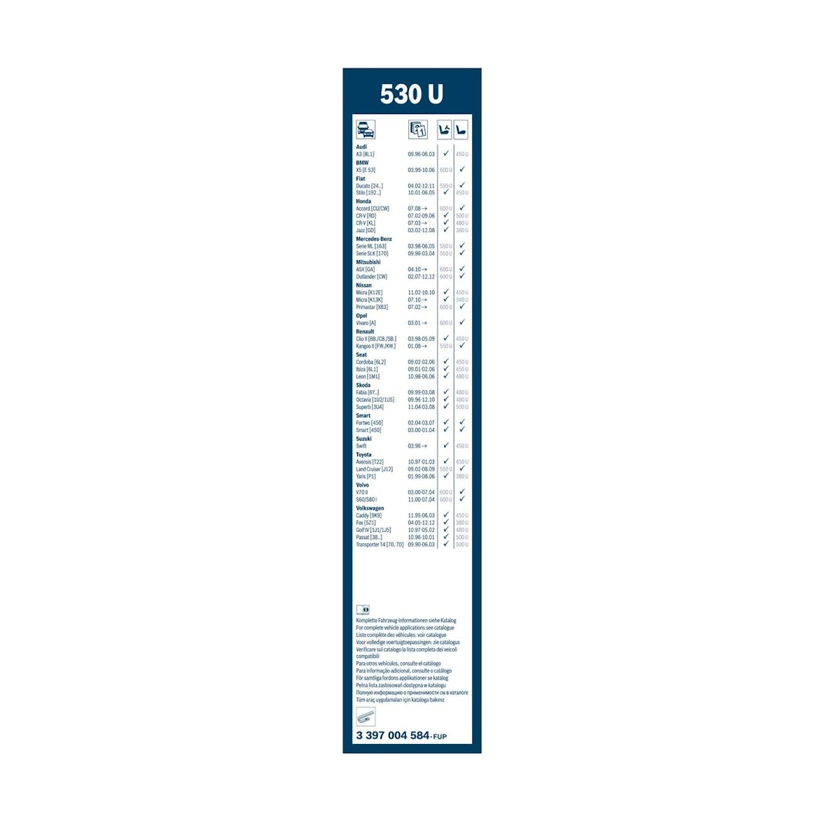 Подходяща за автомобили със стандартни рамкови чистачки с куково рамо и дължина 530 мм – като Toyota, Honda, Ford, Nissan, VW, Renault и други.